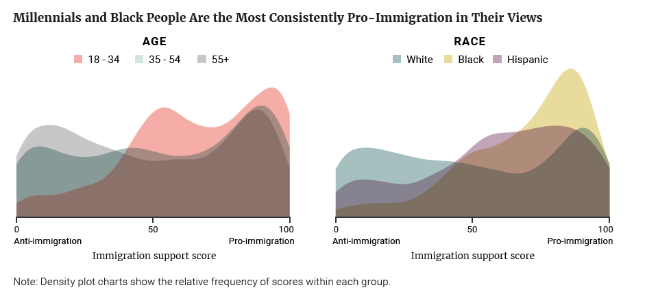 Political divisions are mirrored in generational, educational, and racial divides. The demographic groups that align more with the Democratic Party — including non-white people and younger voters — reflect the same pro-immigration sentiments as Democrats as a whole do, and of course, the reverse is true of Republicans. We see this in visualizing net support on key questions and in the distribution of immigration support scores across groups.